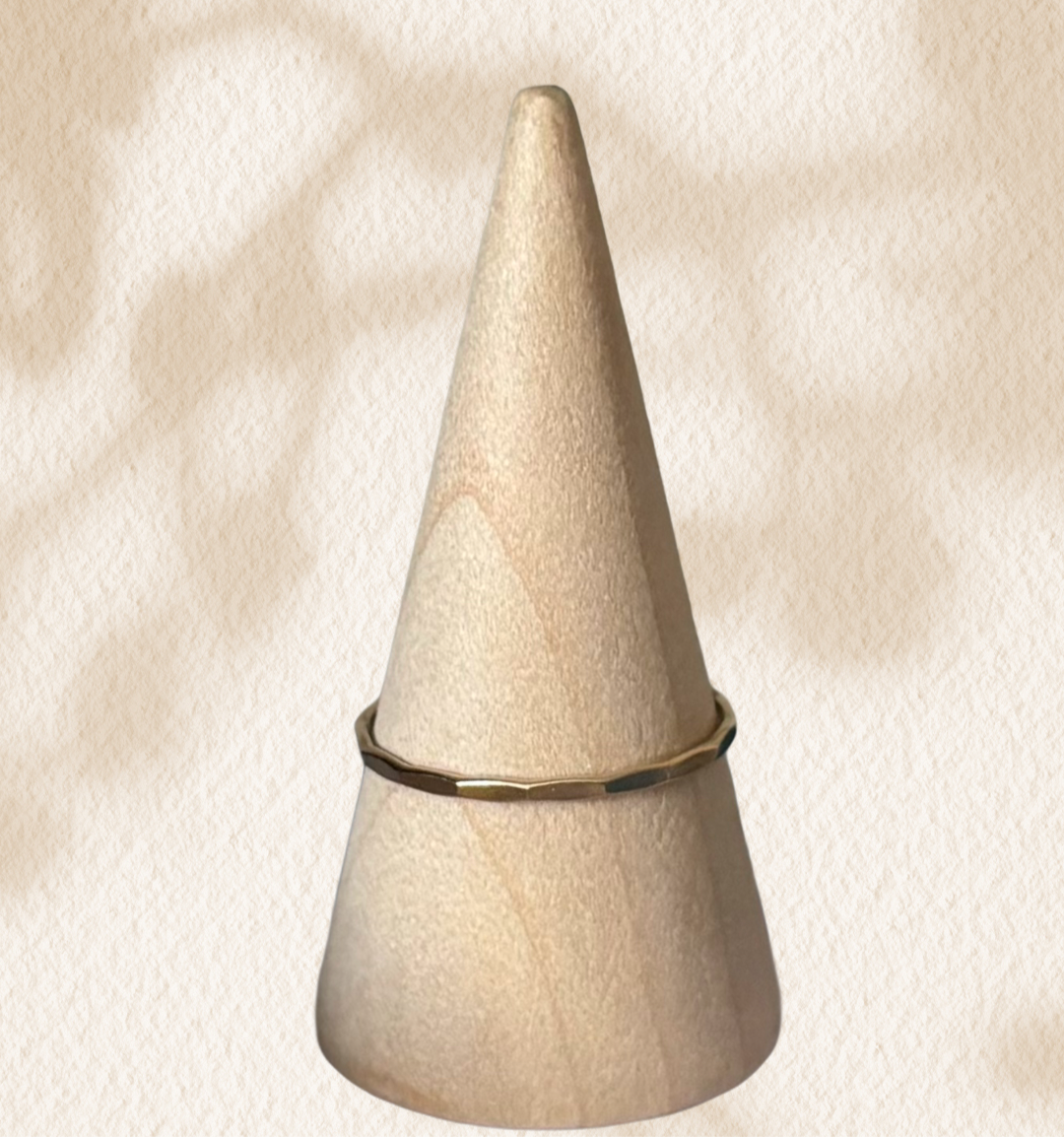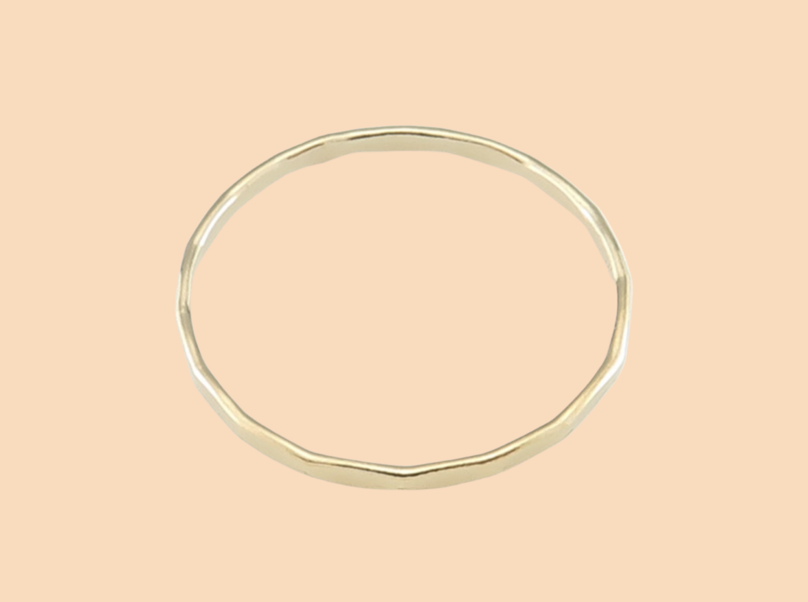 This is a simple yet elegant thin ring with a hammered effect. It can be used as a stacking ring or simply be worn on its own.